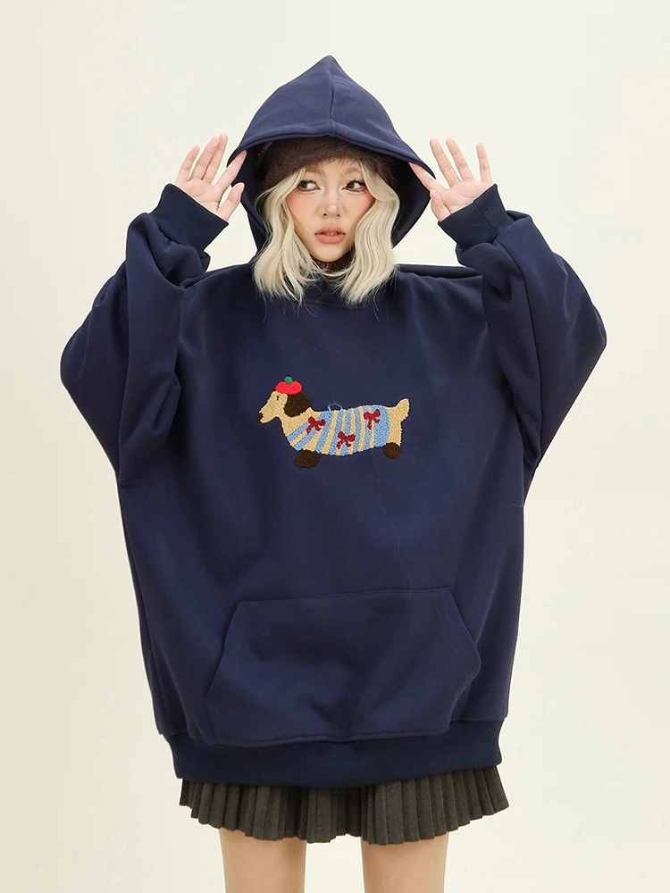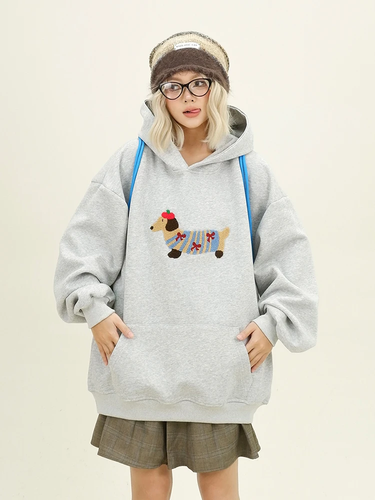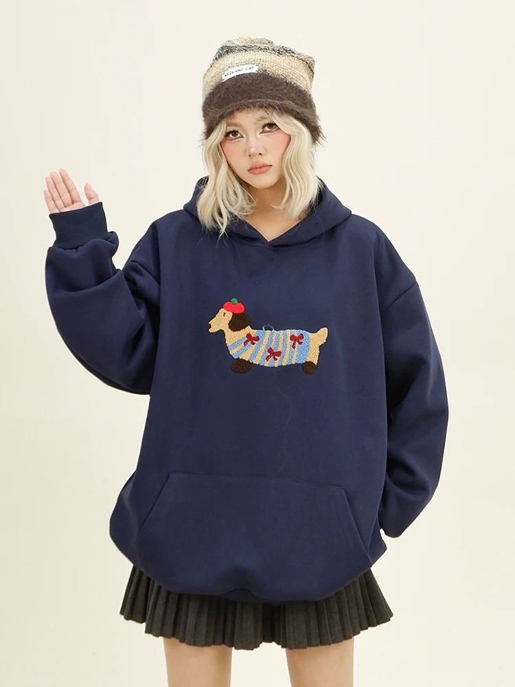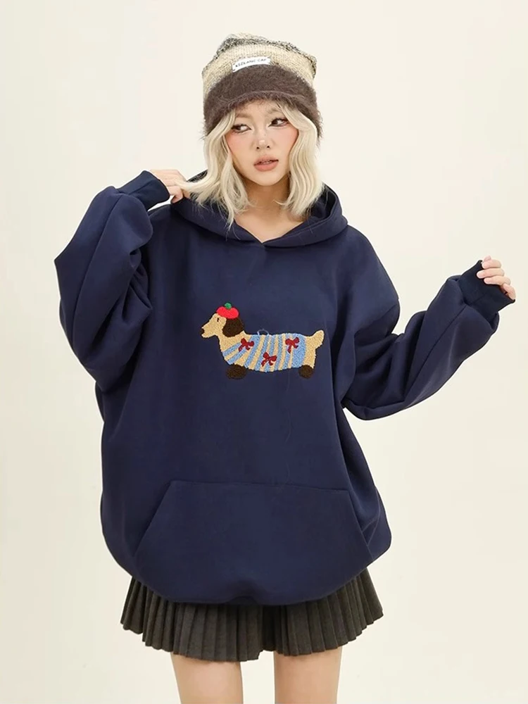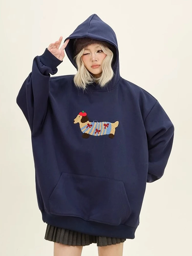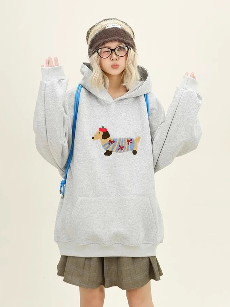 Women Sweatshirt Streetwear Couples Tops Casual Loose Hoodie Autumn Winter Cartoon Dog Embroidery Hooded Pullover